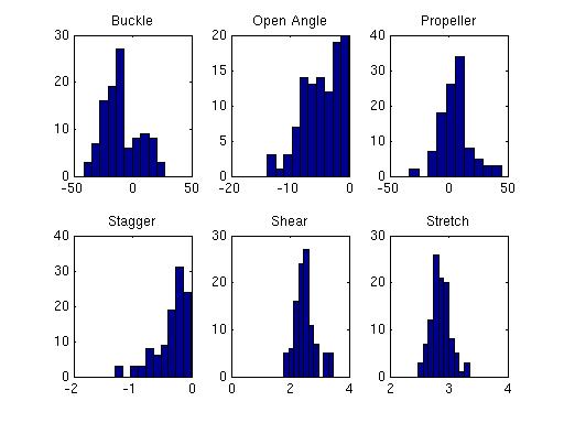 Distributions of basepair parameters (Mukherjee et. al, 2006) for the A:A H:H T basepairs obtained from non-redundant dataset of RNA crystal structures (Ray et. al, 2012)