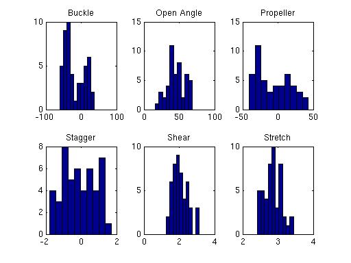 Distributions of basepair parameters (Mukherjee et. al, 2006) for the A:G w:s C basepairs obtained from non-redundant dataset of RNA crystal structures (Ray et. al, 2012)