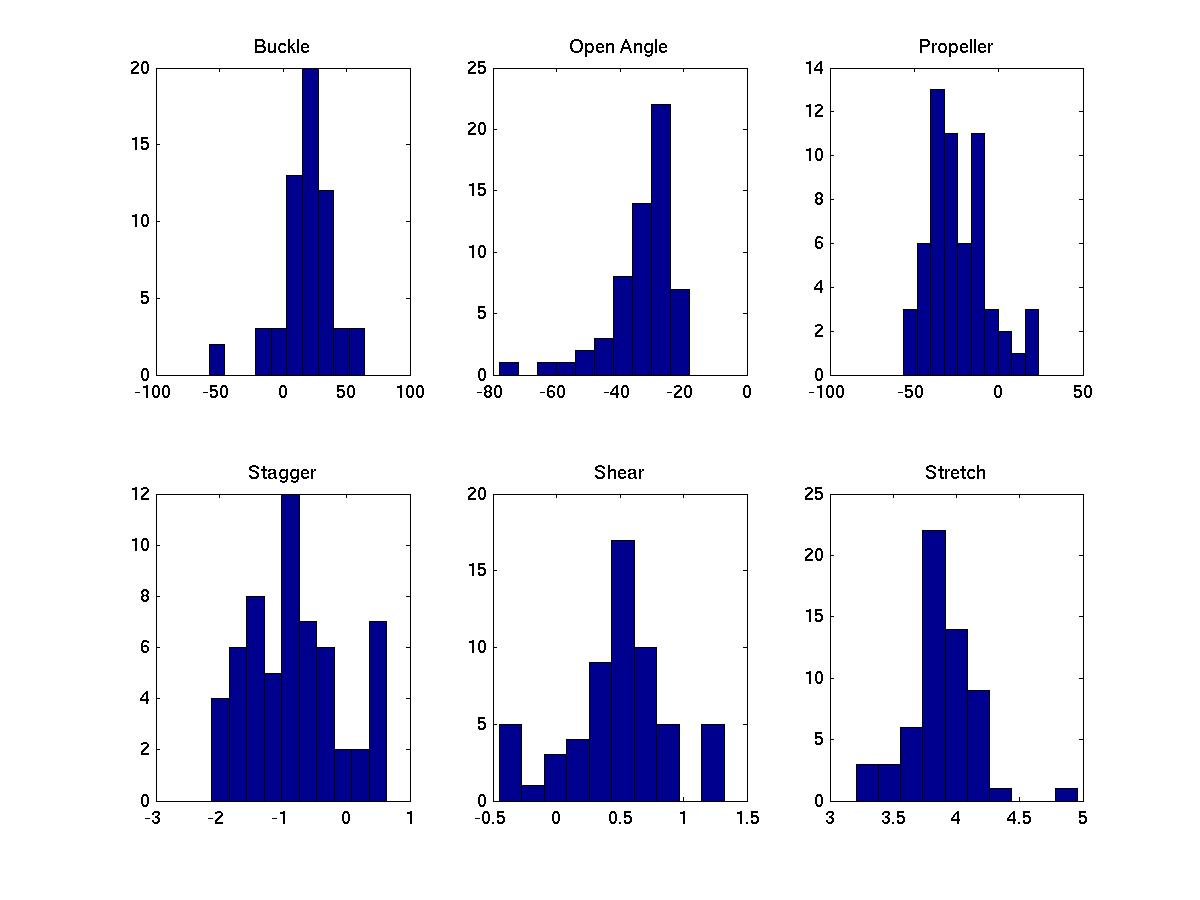 Distributions of basepair parameters (Mukherjee et. al, 2006) for the A:U s:s C basepairs obtained from non-redundant dataset of RNA crystal structures (Ray et. al, 2012)