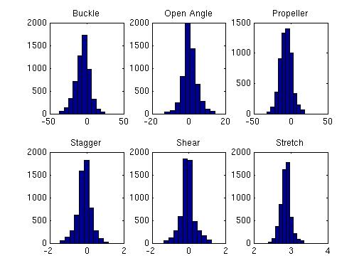 Distributions of basepair parameters (Mukherjee et. al, 2006) for the G:C W:W C basepairs obtained from non-redundant dataset of RNA crystal structures (Ray et. al, 2012)